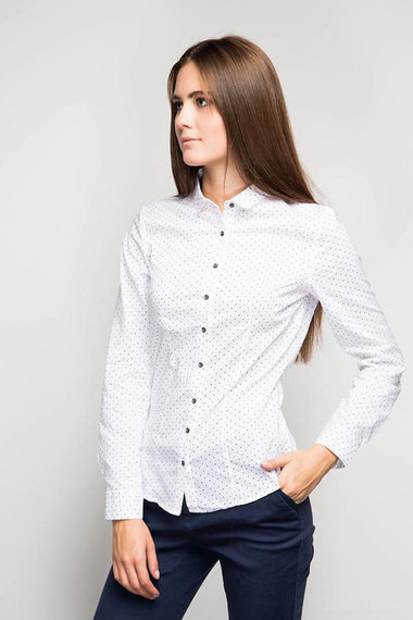 Классическая белая блузка с длинными рукавами и рубашечным воротником. Модель выполнена из хлопковой ткани в крапинку.